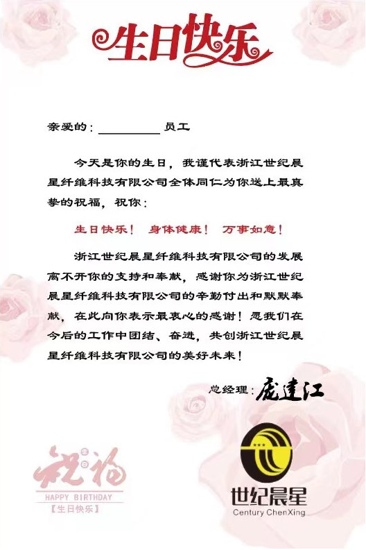 A fim de promover a Cultura Empresarial Century Chenxing, cada funcionário sentiu o carinho e o cuidado da empresa, e os líderes superiores enviaram pessoalmente bênçãos de aniversário e cartões de compras de supermercado em seu aniversário. As empresas têm dado afirmação e gratidão ao trabalho de longo prazo dos funcionários e também expressam o cuidado da empresa com os funcionários. Moldar uma gestão humanizada de excelência, promovendo a confiança dos colaboradores na empresa e promovendo o desenvolvimento de um desenvolvimento saudável e uniforme.
